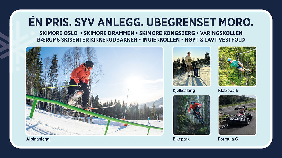 Skimore gir deg tilgang til Skimore Oslo (Tryvann, Wyller, kjelkeutleie i Korketrekkeren på Frognerseteren og H&L klatrepark), Skimore Drammen (Skisenter og en av Norges beste downhill sykkelparker), Skimore Kongsberg (Skisenter, Formula G og sykkelheis),Varingskollen Alpinsenter (Skisenter) Høyt & Lavt Vestfold (Klatrepark), Bærums Skisenter – Kirkerudbakken (Skisenter) og Ingierkollen Slalåmsenter (Skisenter)